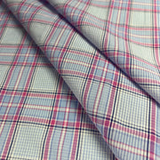 Blue and pink yarn-dye plaid in 100% cotton shirting delivers crisp, breathable comfort for spring and summer wear. This lightweight woven fabric works beautifully for buttondowns, casual tops, and everyday garments in both menswear and womenswear styles. The timeless plaid pattern adds visual interest while maintaining versatile styling potential. Sold by the yard.