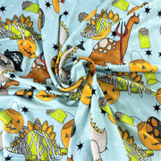 This colorful Halloween print is filled with fun images of dinosaurs, pumpkin baskets, stars, and chocolate treats on a light blue background. This is a super soft knit fabric with a 4-way stretch and a butter soft feel. This fabric is light weight (200 gsm) and printed in America.