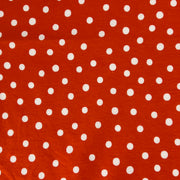 This orange jersey fabric, sprinkled with white dots, offers a fun pop of color in a soft and stretchy knit. Great for easygoing, everyday pieces or statement accents.