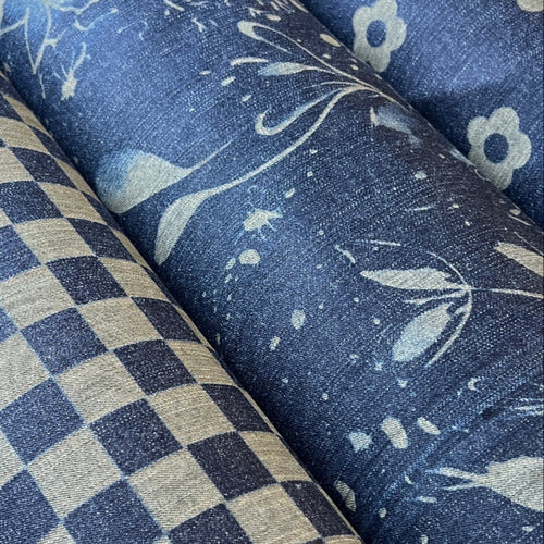 These patterns are available in limited yardage by the yard, but can be custom purchased by the roll on any denim of your choosing - contact us for pricing, MOQ, and other details.