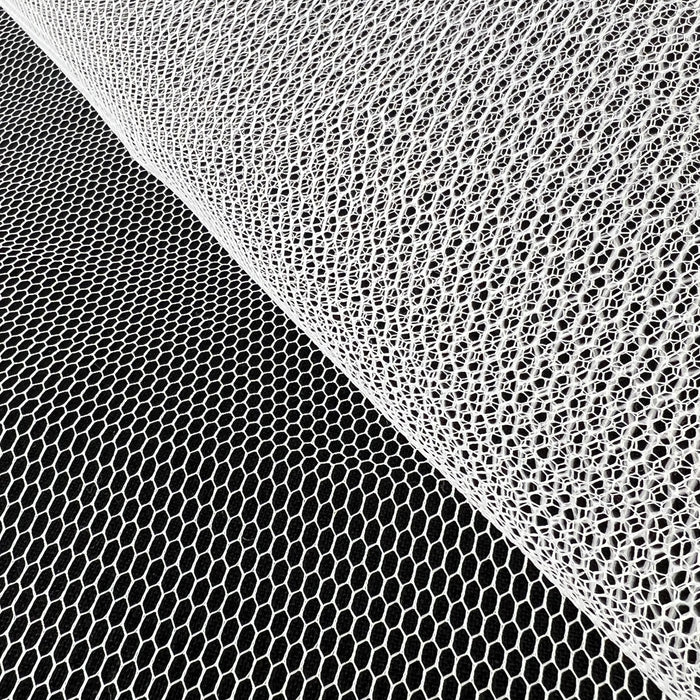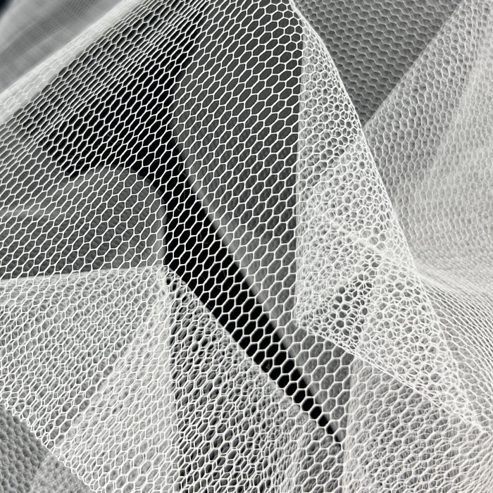Polyester Tulle in white offers a lightweight, sheer texture perfect for adding volume to dresses, tutus, and various craft projects. Its durable polyester fibers maintain shape and structure without adding excess weight, making it an excellent choice for creating elegant, full silhouettes with ease. Ideal for designers and crafters seeking reliable fabric to enhance their creations.